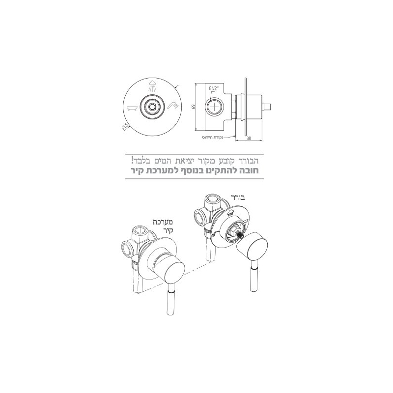 את הבורר ניתן להתקין בכל מיקום ביחס למערכת הקיר (3 או 4 דרך) והוא אחראי על הפניית המים לאביזר הקצה הרצוי (ולא על הטמפרטורה ועוצמת הזרימה).