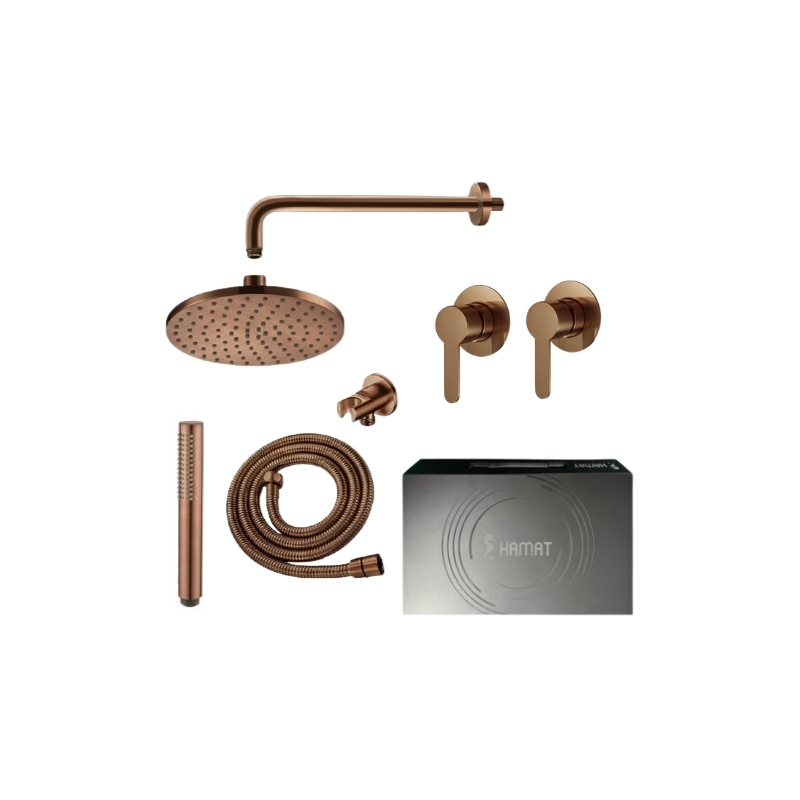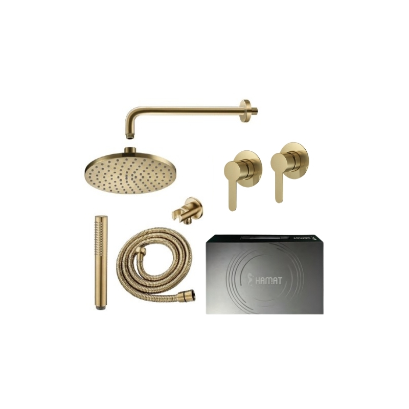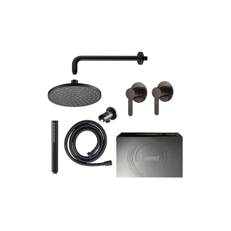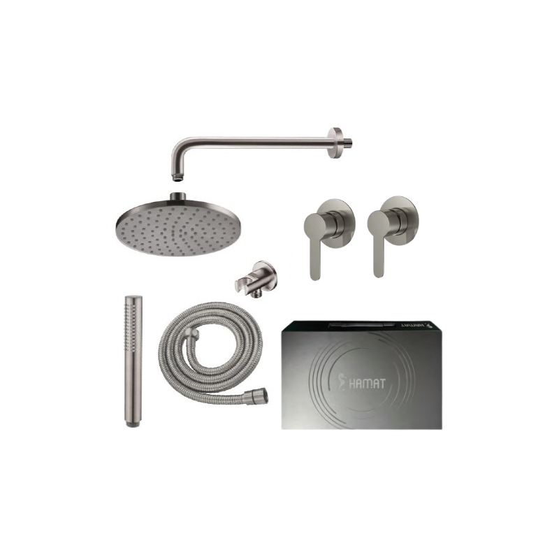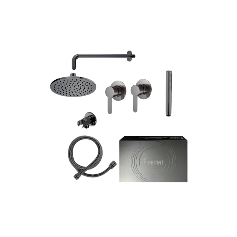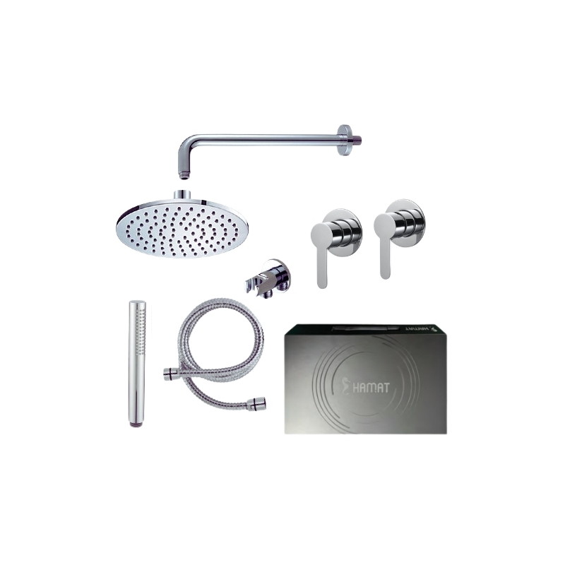 הסט כולל 2 מערכות קיר קליר (גוף+כיסוי+ידית) 308081, זרוע מהקיר + ראש מקלחת Ø25 ס״מ + נקודת מים עגולה עם מתלה + צינור 1.5 מטר + מזלף .