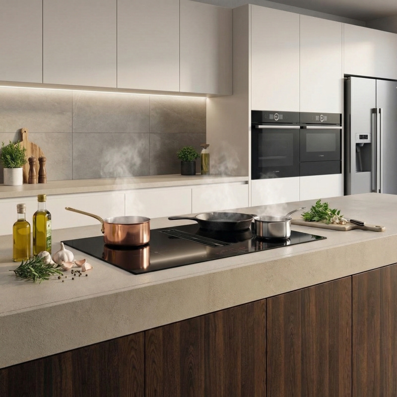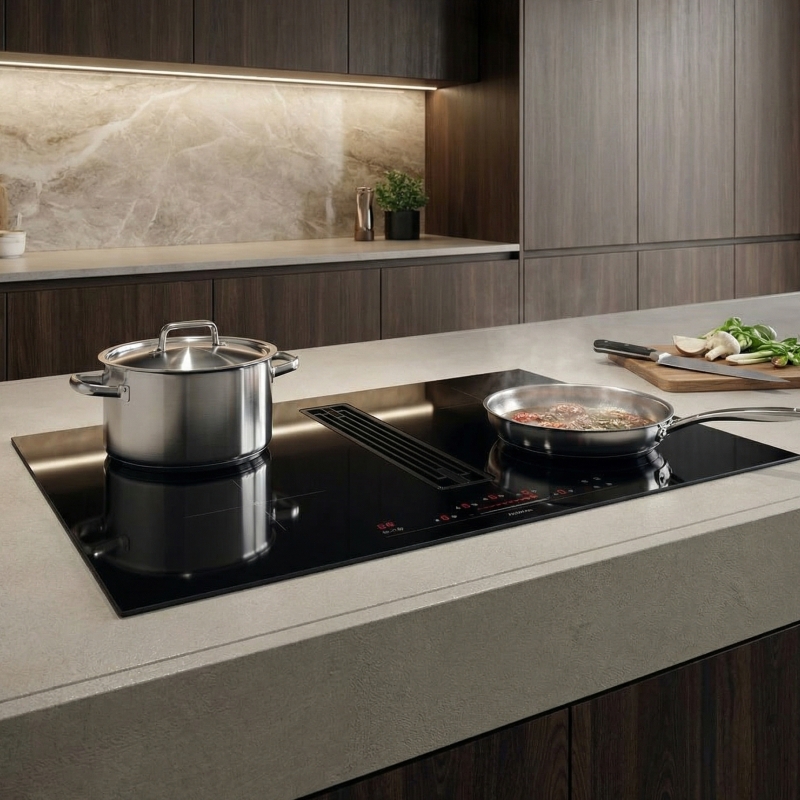 הכיריים החשמליות INNOVA ARTIS PRIMA 60F הן כיריים חכמות בעלות קולט אדים עוצמתי במרכז.
